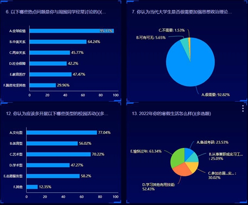 三月中旬,学工部面向全体在校学生开展春季学期思想动态问卷调查,实际发放网络问卷近13000份,回收有效问卷8940份。问卷围绕思政教育开展、时政热点关注、国际国内形势变化、疫情防控、思政理论教学、假期与返校状态切换、心理健康、就业规划等内容设置问题,在校学生整体思想状况进一步显现,对做好学生思政教育与服务管理具有较大参考价值。