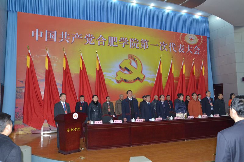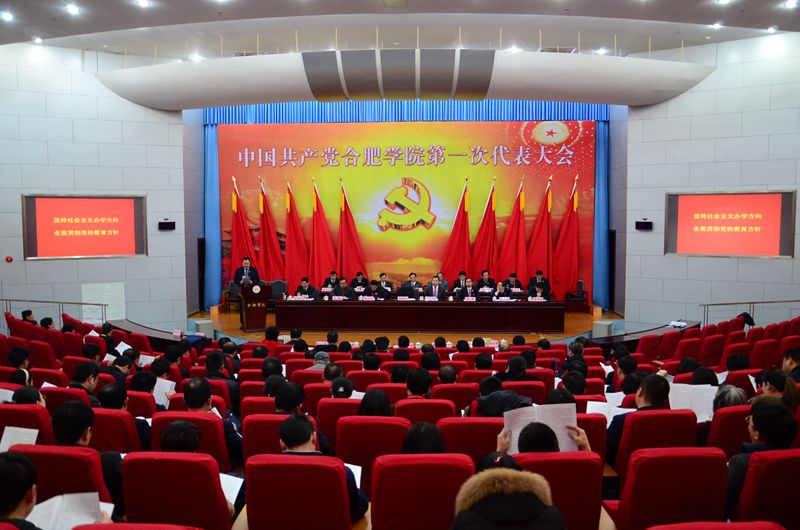 报告厅内气氛庄严热烈,大会主席台上方悬挂着“中国共产党合肥学院第一次代表大会”的会标,下方正中是金光闪闪的党徽,鲜艳的红旗分列两侧。本次大会的主题是:高举中国特色社会主义伟大旗帜,以邓小平理论和“三个代表”重要思想、科学发展观为指导,全面贯彻党的十八大和十八届三中、四中全会精神,深入学习贯彻习近平总书记系列重要讲话精神,坚持改革创新、开放办学,主动适应地方经济发展新常态,主动适应高等教育改革与发展的新趋势,全面深化教育教学改革,全面推进依法治校,全面加强党的建设,以人才培养为根本,以提高质量为核心,以改革创新为动力,解放思想、凝心聚力、攻坚克难,以更加开阔的视野、更加奋发的精神、更加务实的作风、更加执着的努力,加快推进地方应用型高水平大学建设进程。