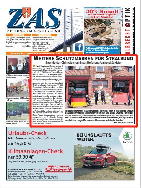 Die Stadtregierung von Stralsund hielt eine einfache und feierliche Empfangszeremonie ab. Der Bürgermeister Herr Badrow und das Notfallmanagementteam der Stadt hielten die Nationalflaggen Chinas und Deutschlands und dankten den chinesischen Freunden für ihre Unterstützung. Die Webseite der Stadtregierung und viele lokale Medien berichteten darüber. Die der Stralsund-Zeitung veröffentlichte am 28. Juni einen Bericht mit dem Titel Chinesische Stadt Hefei und Universität Hefei spenden weitere Schutzmasken für Stralsund und dankte für die großzügige Unterstützung unserer Universität im kritischen Moment der Epidemie.