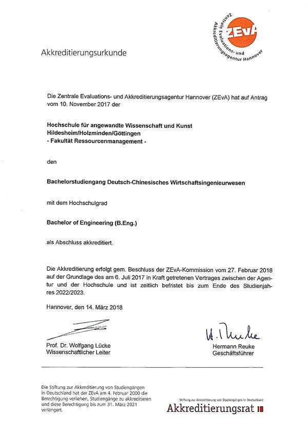 Am 14. März 2018 akkreditierte die zentrale evalsuations- und Akkreditierungsagentur den Bachelorstudiengang „Deutsch-Chinesisches Wirtschaftsingenieurwesen“, der den Studienabschluss „Bachelor of Engineering“ vorsieht. Dieser Studiengang gilt als der erste von Deutschland akkreditierte Studiengang in der Provinz Anhui. Dies kann man als großen Erfolg der Zusammenarbeit zwischen der Universität Hefei und der Hochschule für angewandte Wissenschaft und Kunst Hildesheim/Holzminden/Göttingen ansehen. Die Universität Hefei sieht es als Aufgabe an, den Studiengang weiterzuentwickeln und die deutsch-chinesische Zusammenarbeit auszubauen.