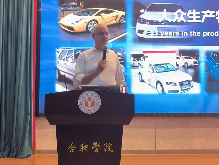 10月31日,学校客座教授、大众安徽首席制造官施耐德教授在图书馆学术报告厅为大众学院2022级学生上了一堂内容丰富生动的先进制造和智能网联专业课。