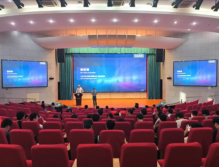 施耐德教授围绕大众汽车,对汽车制造工艺、汽车生产中的智能化趋势应用案例以及智能制造方案如何落地等内容进行了详细讲解。在互动交流环节,同学们积极提问,施耐德教授耐心解答,并对大众学院的学生提出了殷切期望。
